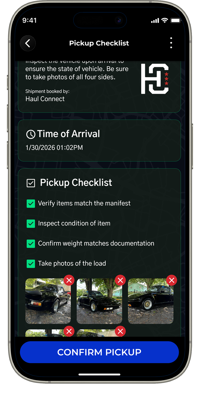 Pickups and deliveries both require photos of the cargo loaded onto your truck or trailer.
